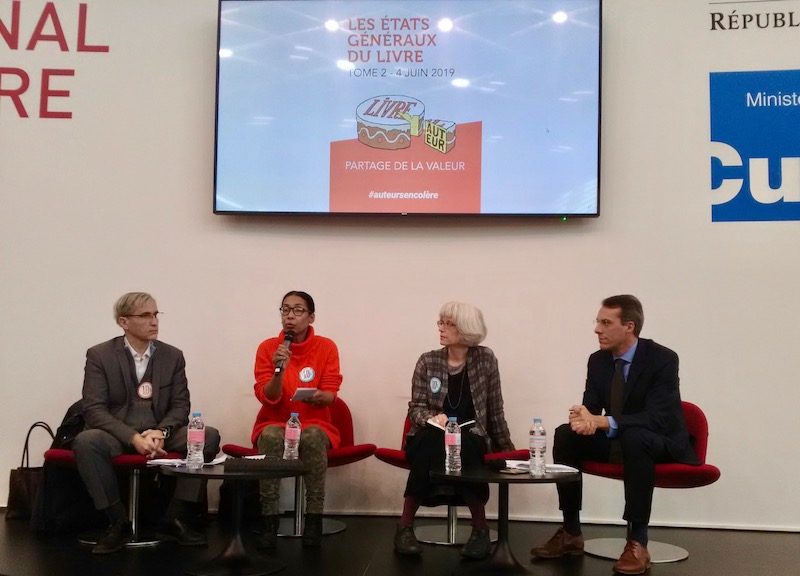 De gauche à droite : Emmanuel de Rengervé, délégué général du Snac ; Bessora Nan Nguema, vice-présidente du Syndicat national des auteurs et compositeurs (Snac) ; Corinna Gepner, présidente de l’Association des traducteurs littéraires de France ; Patrice Locmant, directeur de la Société des gens de Lettres (SGDL)