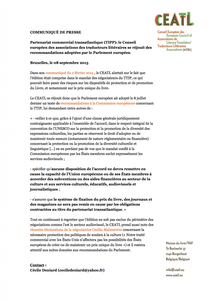Le CEATL se réjouit– et nous de même – que le Parlement européen soutienne la loi sur le prix unique du livre et, plus généralement, la politique de soutien au secteur du livre dans les négociations en vue du fameux Partenariat commercial transatlantique – aussi appelé TTIP ou encore TAFTA.